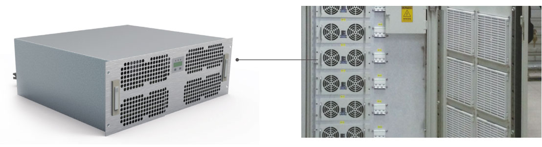 MACS module power supply adopts IGBT high frequency technology and the air cooling mode. MACS module power supply is provided with a DSP dual-core processor manufactured by Texas Instruments to communicate with the monitoring unit. The internal parameters can be set by the upper monitoring unit through a CAN interface or can be controlled by the upper monitoring unit. MACS module power supply adopts the soft switching technology, thereby having high efficiency and good electromagnetic compatibility; MACS module power supply has a built-in CPU control, thereby being stable and reliable and having ultra wide input voltage range. MACS module power supply has functions of input overvoltage and undervoltage protection, output current limit protection, output overvoltage protection, output short circuit protection, over-temperature protection and alarm, is connected with n + 1 modules in parallel and has the current sharing function.